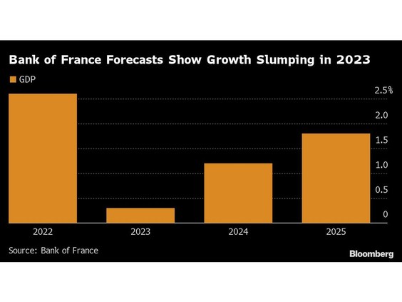 Una demanda más débil de exportaciones francesas, una inflación más fuerte y tasas de interés más altas de lo previsto anteriormente significan que el banco central predice una desaceleración del crecimiento a solo 0,3% en 2023, muy por debajo del 1% que el Ministerio de Finanzas ha incluido en el presupuesto. Dijo que no se puede descartar una recesión, aunque sería temporal y limitada.