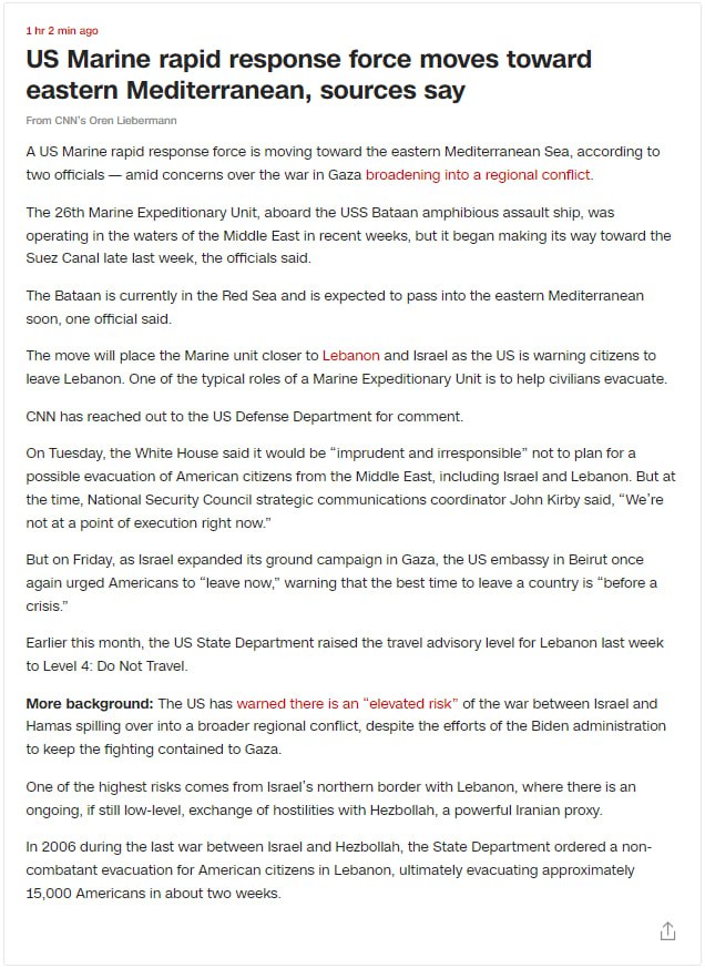 🇺🇸🪖❗️ — 📰 CNN News: La fuerza de respuesta rápida de los marines de EE. UU. avanza hacia el Mediterráneo oriental, dicen fuentes