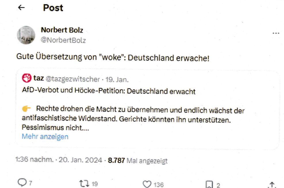 El 20 de enero de 2024, Bolz escribió en una publicación en X (anteriormente Twitter): "Buena traducción de 'woke': ¡Alemania despierta!". Bolz citó un artículo del periódico Taz; la publicación del diario de izquierdas hace referencia a un artículo originalmente titulado "Alemania despierta". El eslogan también aparece en la publicación de X del periódico Taz.